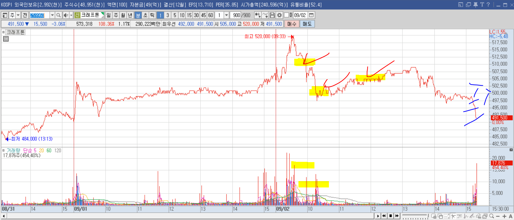 예수금도 빵빵하겠다, 계획에 없던 '일진하이솔루스' 매수...나락...수익률은 -0.64%지만...끊임없이 물타기...매도...매수..매도..매수. 실제로 여기서부터 오늘 매매 망함(심법의 중요성). 그 후에 에코프로와 크래프톤 거래시작. 에코프로와 크래프톤...어떻게 매매했는지도 기억안남우선, 에코프로는 '유니드'가 매수세가 붙길래 '탄소' 섹터 이슈로 같이 갈거라고 '예상'하고 들어갔다가 물타기하다 손절